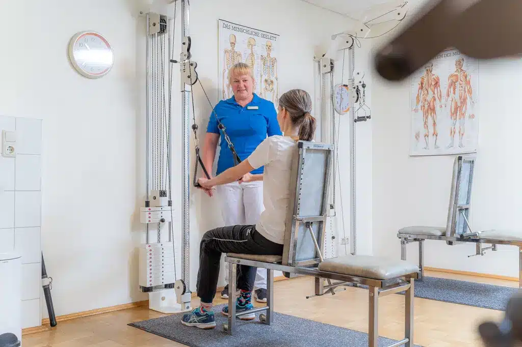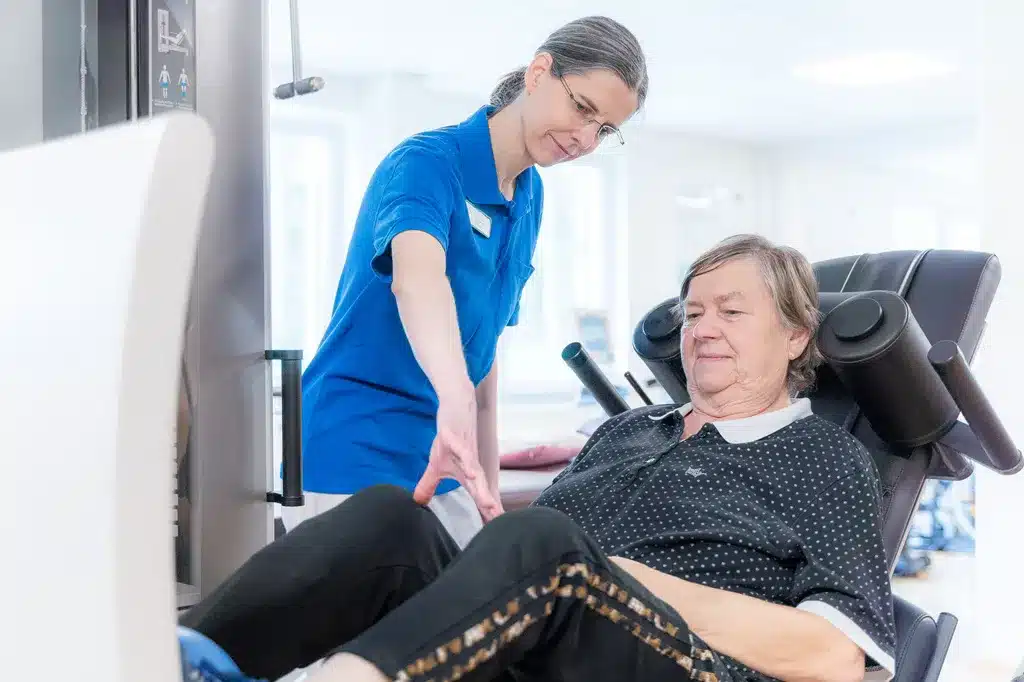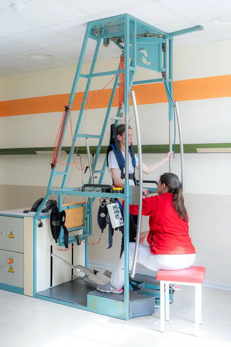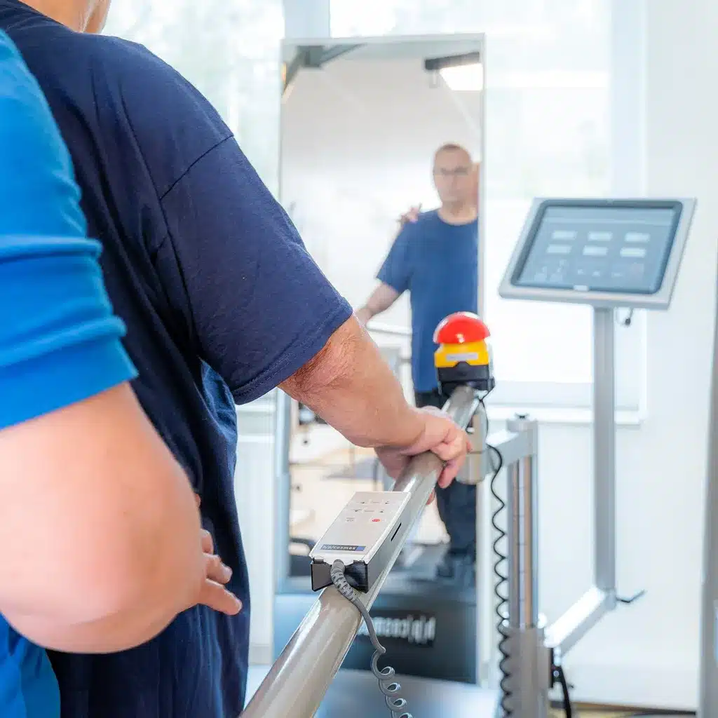 Zur Minderung muskulärer Dysbalancen setzen wir vorrangig die Medizinische Trainingstherapie ein. In enger Zusammenarbeit mit der Physiotherapie fördert die Sporttherapie motorische Lernprozesse, insbesondere das Wiedererlernen des Gehens, unterstützt durch bildgebende Diagnostik (Videofeedback, Ganganalyse) und moderne Geräte zum repetitiven Üben wie Gangtrainer und Laufband. Dabei spielt auch die Schulung koordinativer Fähigkeiten, vor allem der Gleichgewichtsfähigkeit, eine wichtige Rolle.