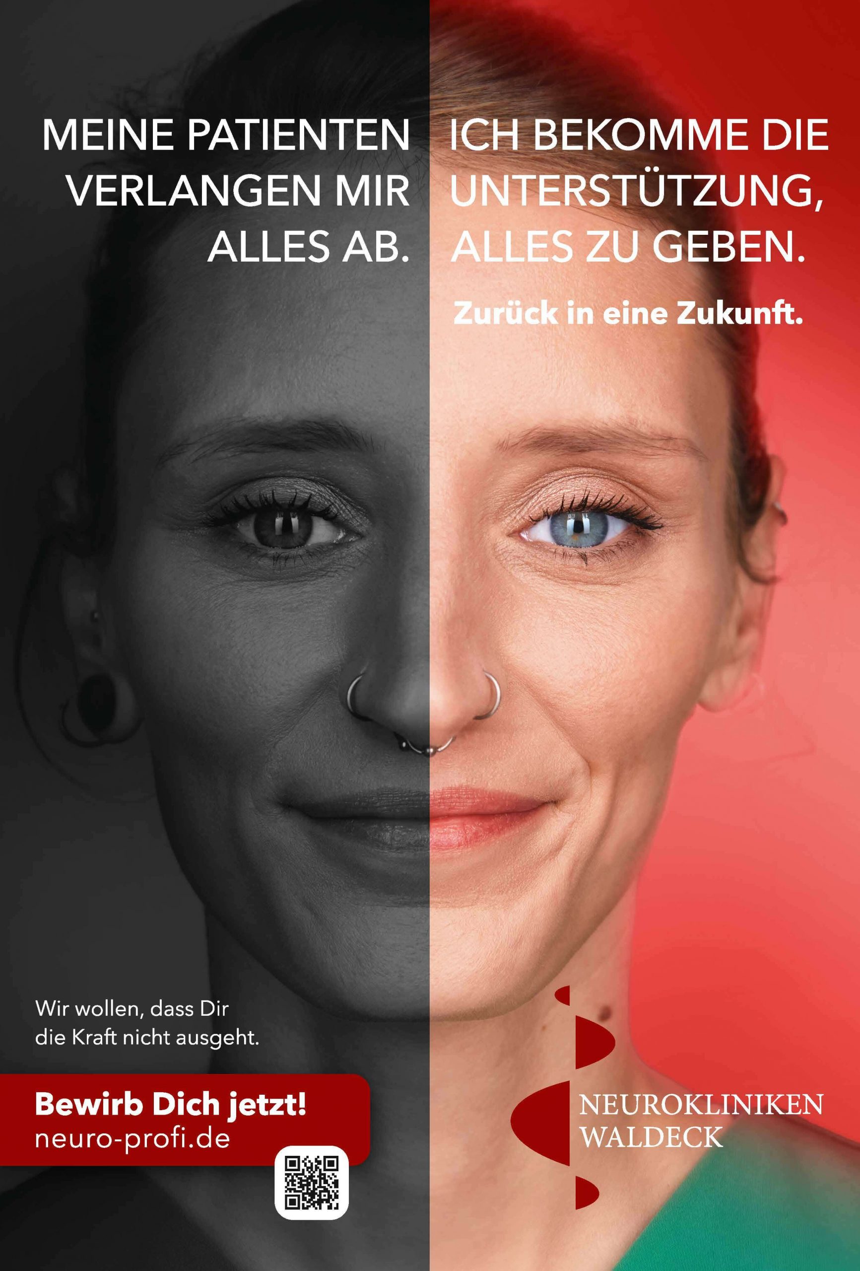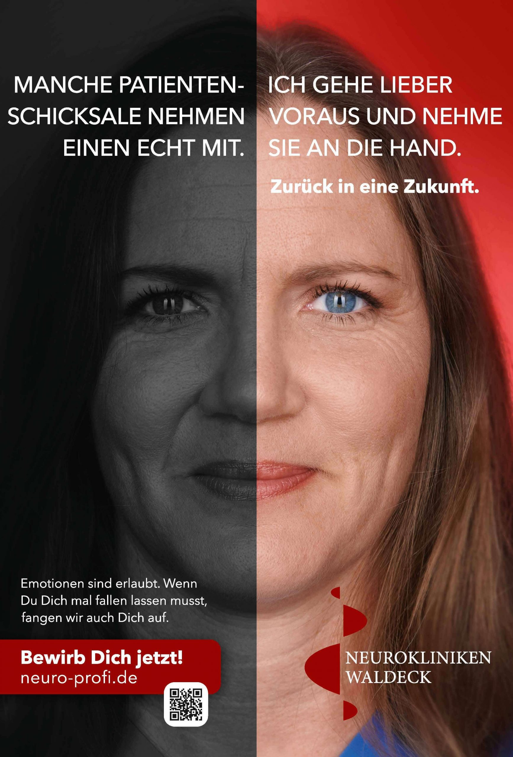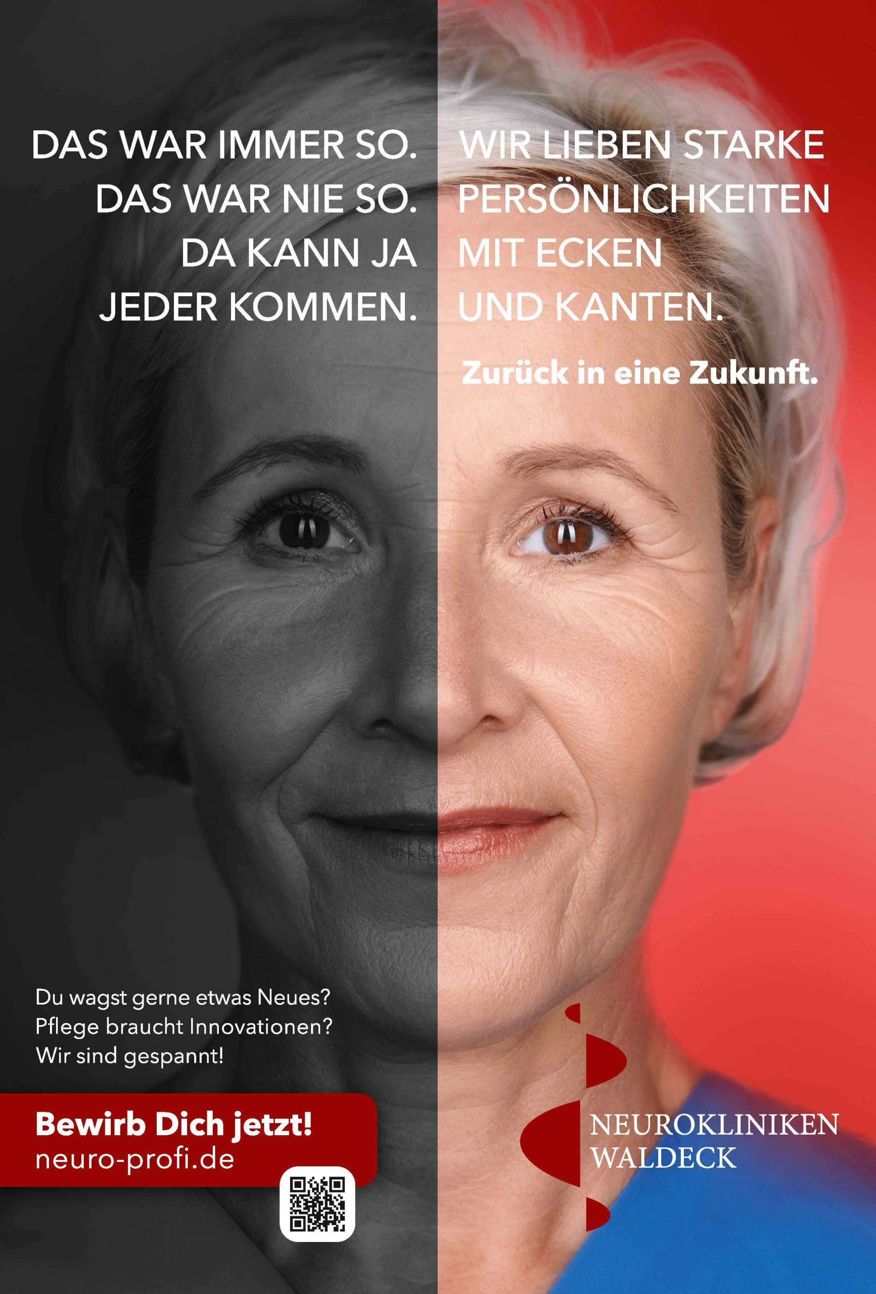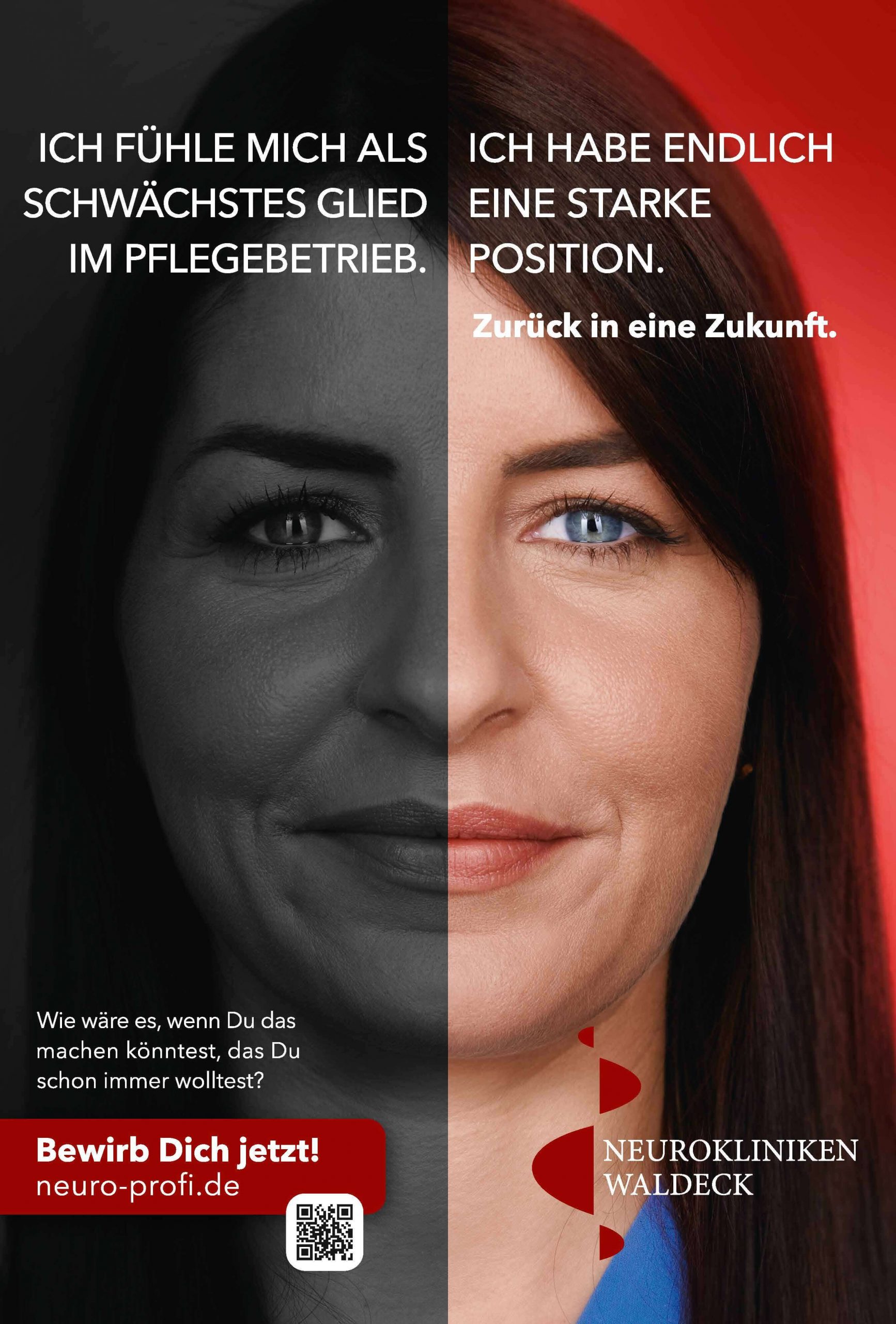 „Neuer Name. Neue Zukunft.“ Damit einhergehend starten die Neurokliniken Waldeck mit einer großangelegten Employer Branding Kampagne, die die Gesichter von Mitarbeiter:innen zeigt. Neun Angestellte aus der Pflege, Ergotherapie, Verwaltung und dem Ärzteteam haben sich frontal ablichten lassen. Herausgekommen sind tolle Motive in Verbindung mit ausdrucksstarken Aussagen über die Neurokliniken Waldeck.